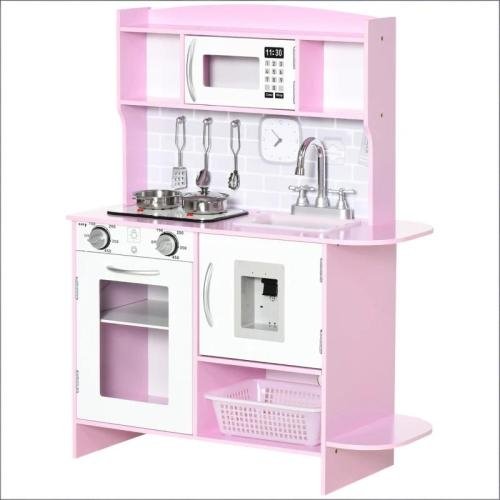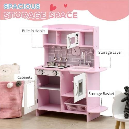 • – Storage Space for Food Toys: This kitchen for kids has tons of storage for food toys. The oven and the water dispenser door lead to large cabinets for when a lot of things need to be put away, and a basket is included for small items. By the microwave, shelving provides more storage. Avoid a mess and keep the toy area clean.