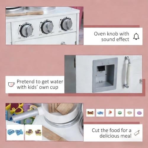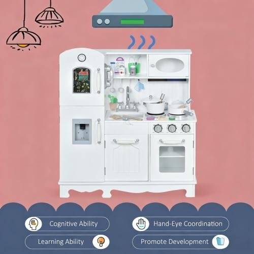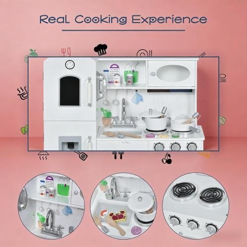 - – Complete Set: Complete kids kitchen set with 1 knife, 1 fork, 1 spoon, 1 saucepan, 1 round pot, 1 spatula, 2 seasoning bottles, 1 crab, 1 onion, 1 mushroom, 1 shrimp, 1 fish, 1 broccoli, 1 telephone, 1 blackboard, and 1 water dispenser to let children experience the fun of hands-on activities.